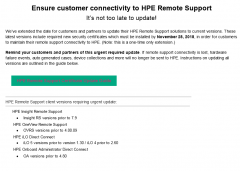 针对所有目前使用HPE远程支持监控管理软件的客户,需要安装新的安全证书以保证设备继续获得HPE远程支持连接,HPE远程支持监控管理软件的最新版本包含了新版本的安全证书,HPE要求客户和合作伙伴必须在2018年11月28日···